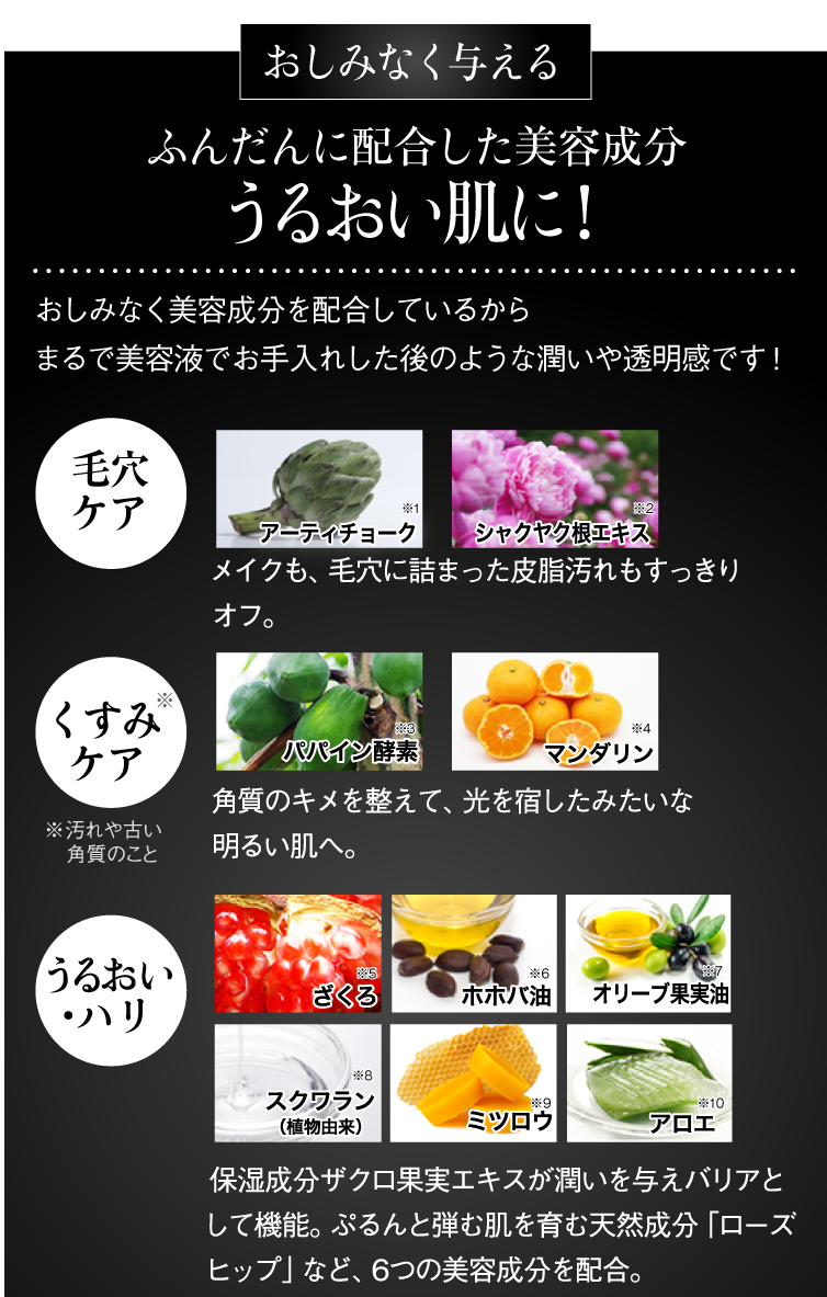 落ちた感あるのにしっとり感もあるってどういうことー?!改めてパンフレットを読んだら、しっかり「落とす」×たっぷり「与える」をコンセプトに、配合成分がきちんと考えられているみたい。